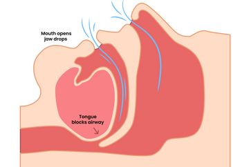 - Tongue falls backwards and blocks the top airway which leads to snoring